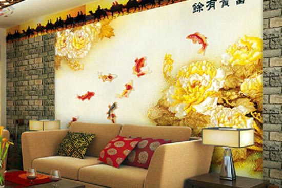 3D壁纸:又叫3D布景墙,操纵最新概况活性处置手艺和光激发手艺,出格的壁纸结果显得更为抢眼,连系我国保守的陶瓷工艺和浮雕彩绘艺术,1.5m宽度,电脑印花工艺,出格是新婚小夫妻,